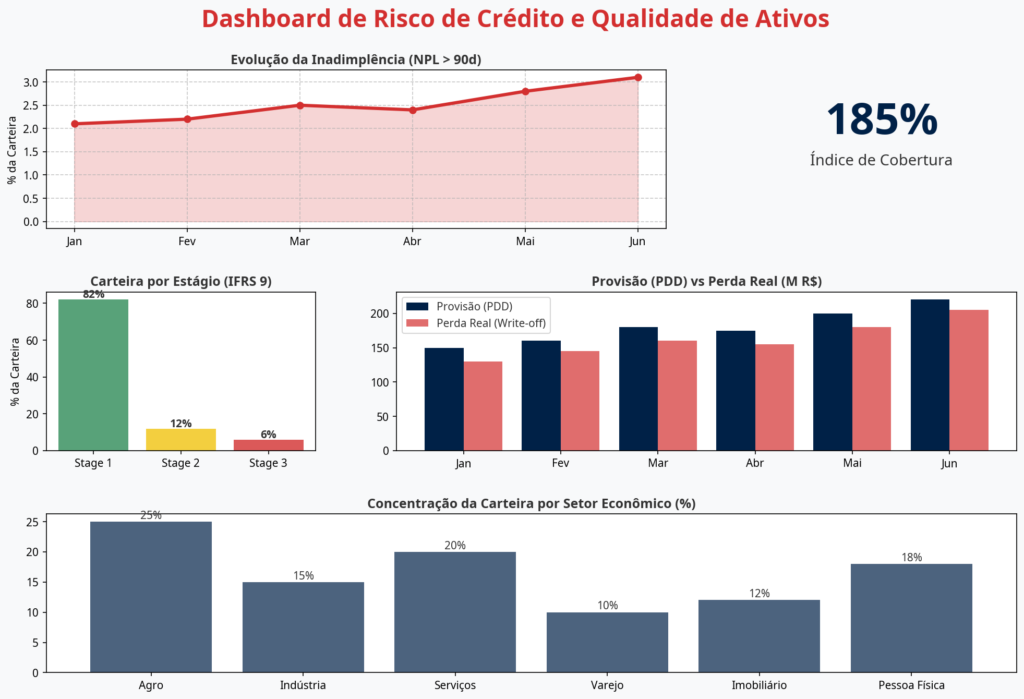 •Evolução da Inadimplência (NPL > 90d): A tendência de alta no gráfico de área serve como um alerta precoce para a deterioração da carteira.